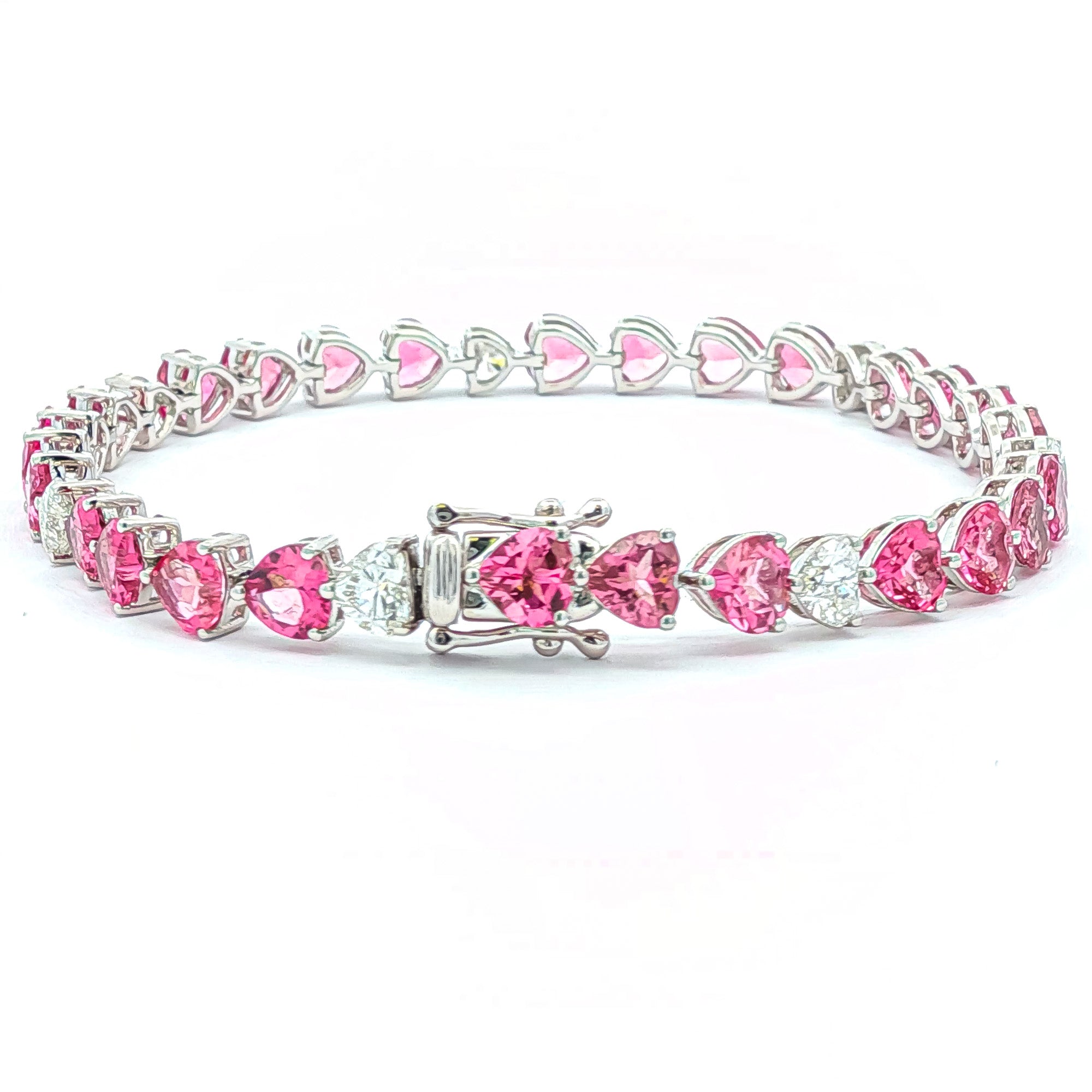 Romantic and radiant, this 14kt white gold tennis bracelet features 11.00 ctw of prong-set heart-shaped pink tourmalines beautifully alternating with 2.20 ctw of sparkling heart-shaped diamonds. Measuring 4.8 mm wide and 7.25 inches long, it secures with a double safety clasp for both elegance and peace of mind—an eye-catching statement of love and luxury.