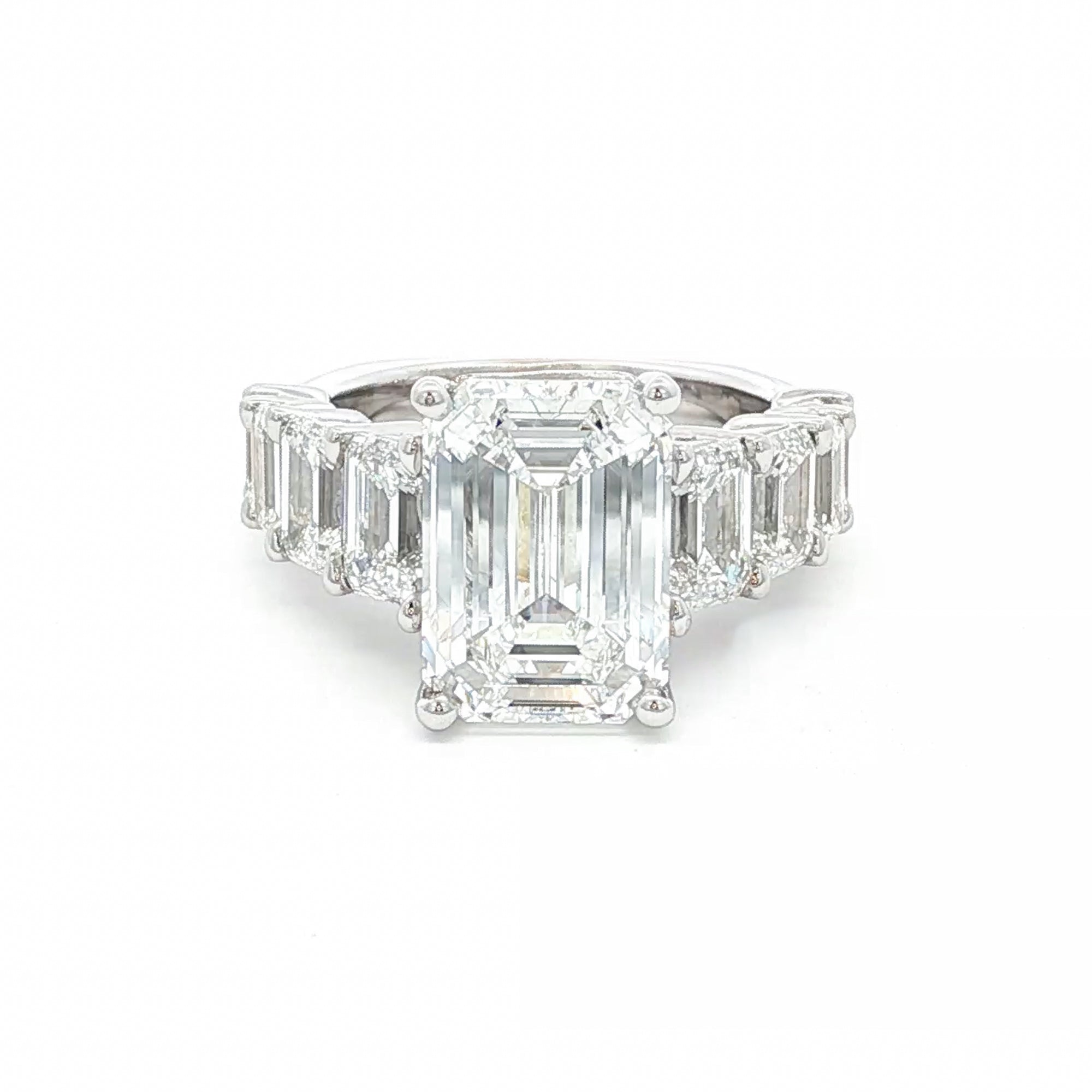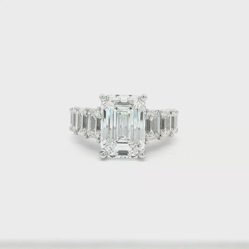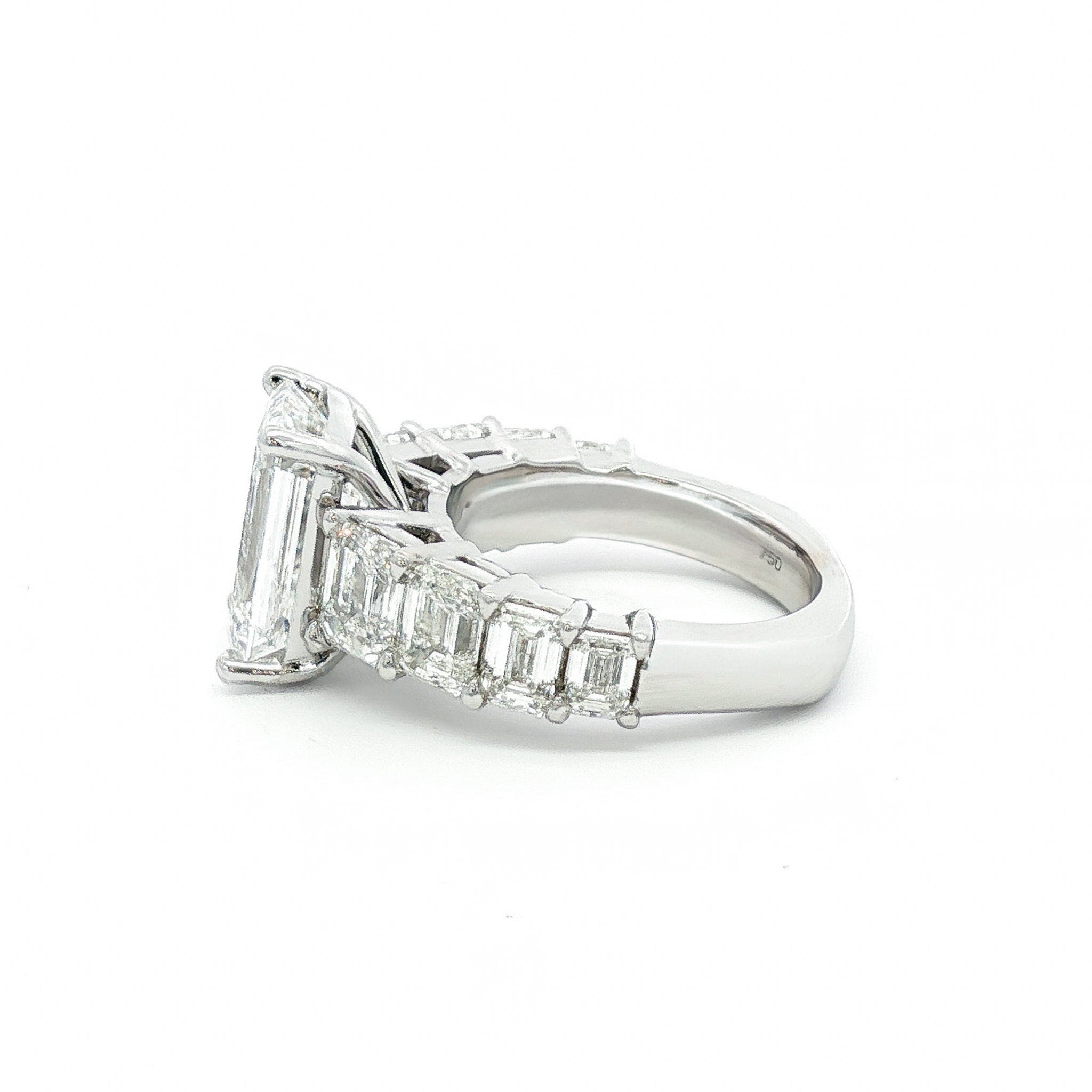 A striking nine-stone design, this luxurious ring showcases a GIA-certified 5.03 ct Emerald Cut diamond, graded E VS1, set in gleaming 18kt white gold. The center stone is framed by 3.50 ctw of graduated emerald-cut diamonds, arranged as eight perfectly matched side stones that create a seamless, stepped progression of brilliance. Crafted with a refined Euro shank for superior balance and comfort, this ring offers a modern architectural elegance with timeless sophistication.