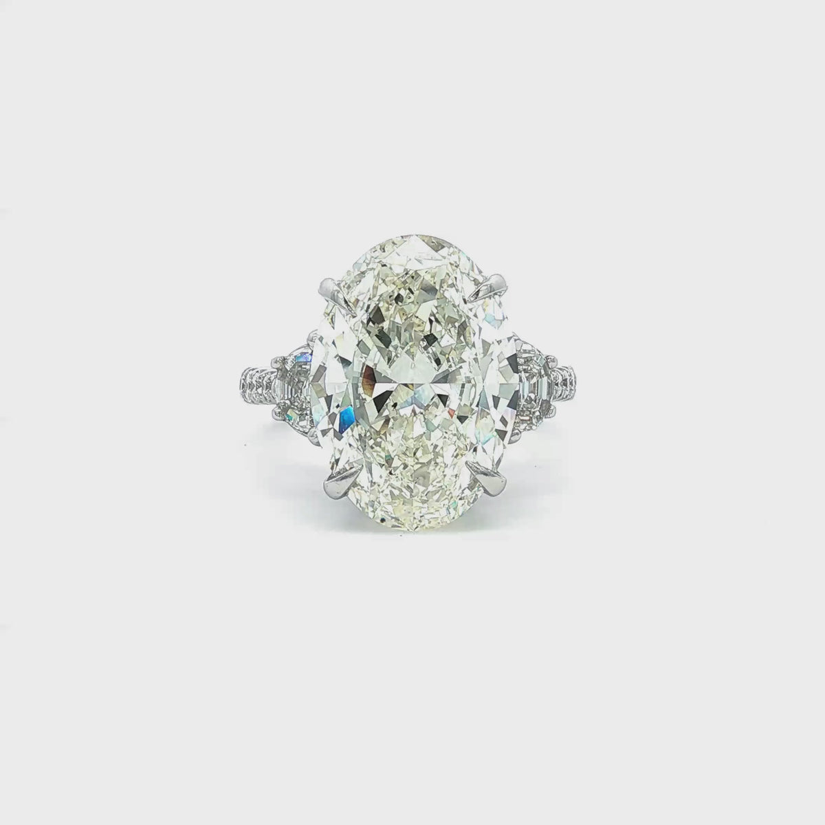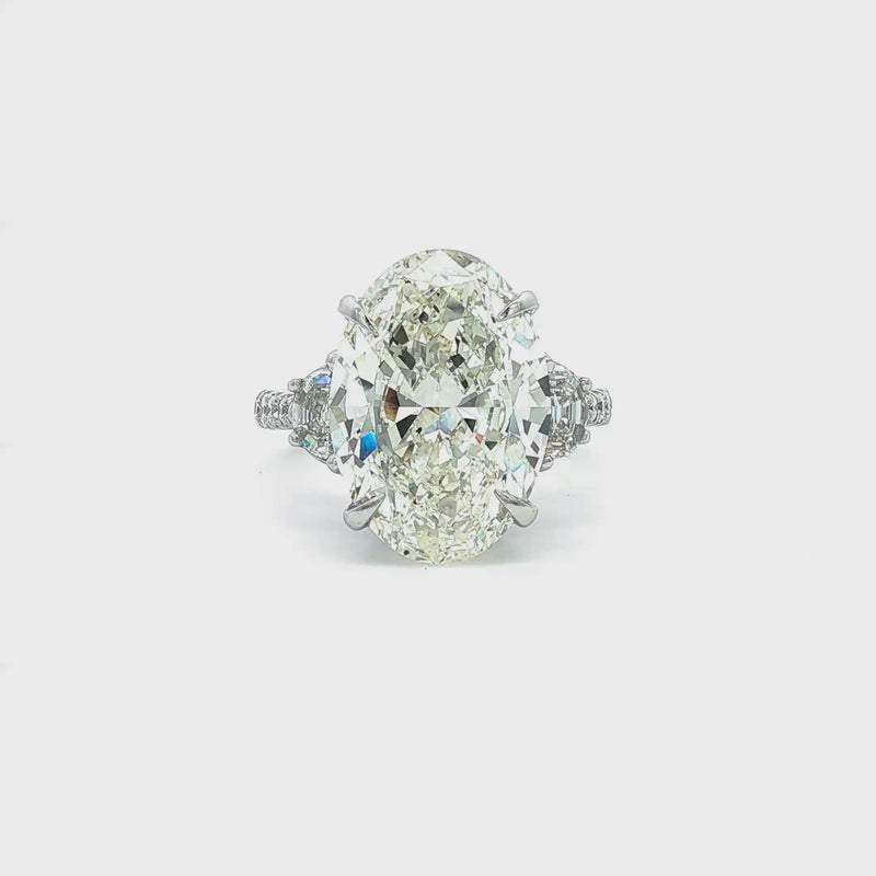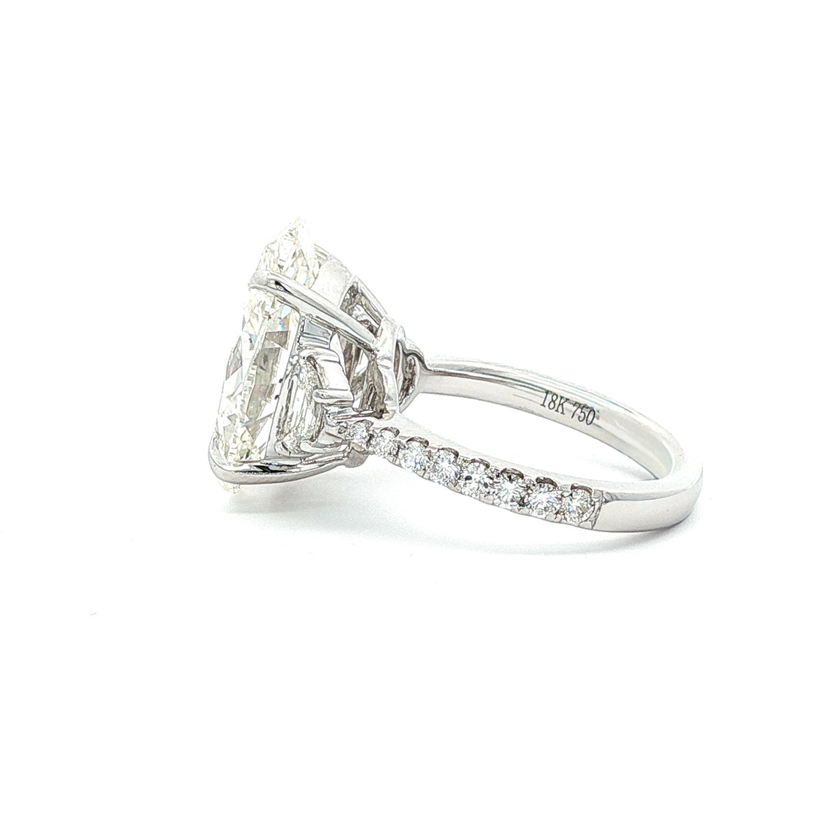 This exquisite engagement ring is crafted in luminous 18kt white gold and showcases a breathtaking 8.02 ct oval-cut diamond, GIA graded J color and SI1 clarity. The center stone is elegantly secured in a classic four-prong setting and flanked by two half moon side stones totaling .60 ctw, creating a refined three-stone silhouette. A tapered pavé shank set with .36 ctw of round brilliant diamonds adds soft sparkle along the band, enhancing the ring’s brilliance from every angle. Timeless and sophisticated, this design beautifully balances bold presence with elegant detail.