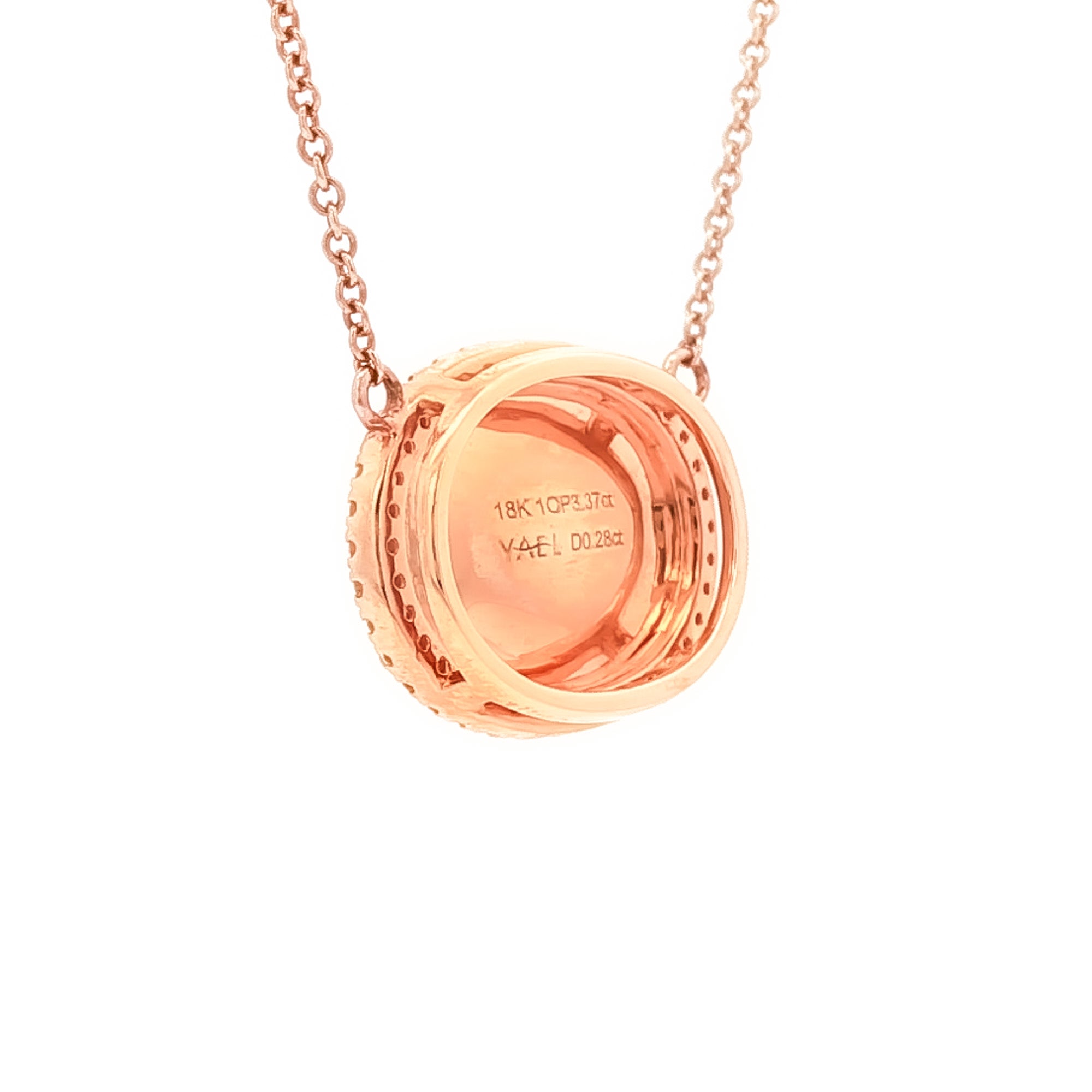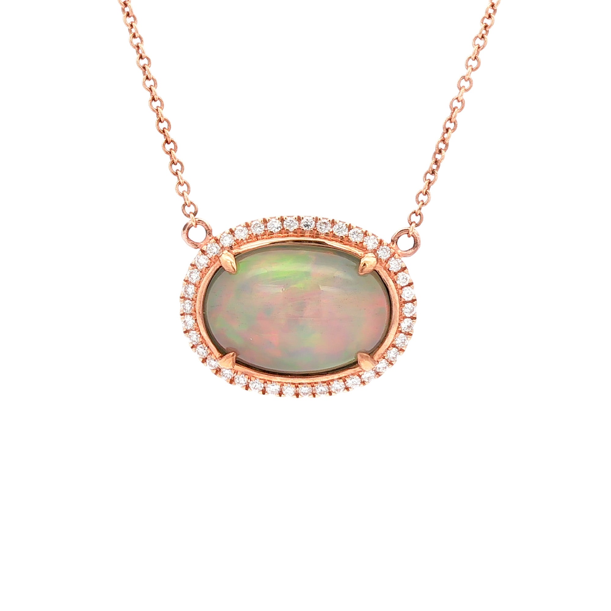 A captivating 3.37 carat oval opal set lengthwise is surrounded by a shimmering 0.28 carat pave diamond halo. Crafted in warm 18K rose gold with a fine cable chain, this elegant necklace showcases timeless beauty and modern sophistication. Pendant measures 8.2mm width x 14mm height with a 17.25 inch overall length.