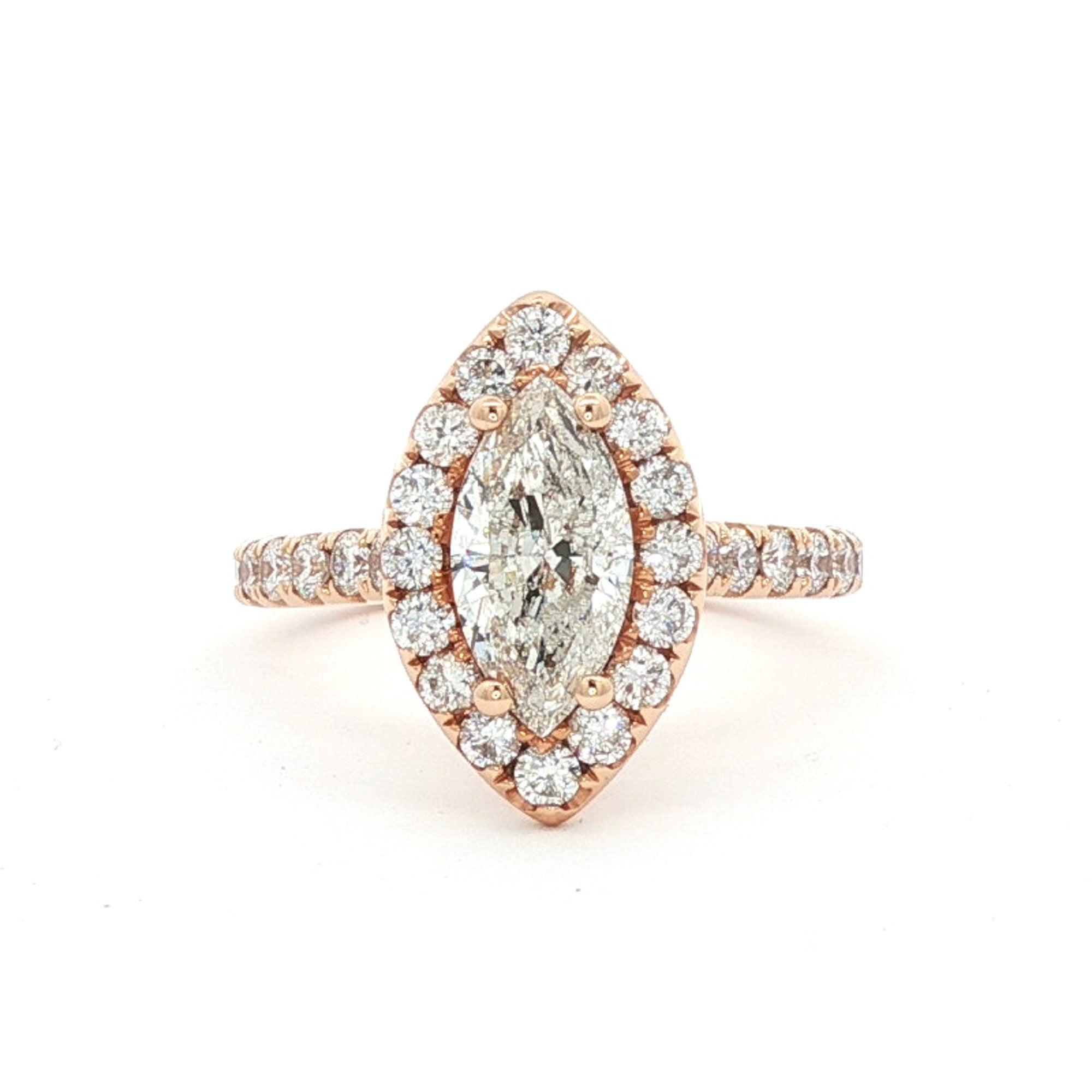 Experience timeless sophistication with this cathedral halo ring, featuring a 1.00 carat marquise-shaped prong set center stone accented by .77 carats of brilliant round pave-set diamonds, all set in polished 18K rose gold. Custom sizes may be available upon request.
