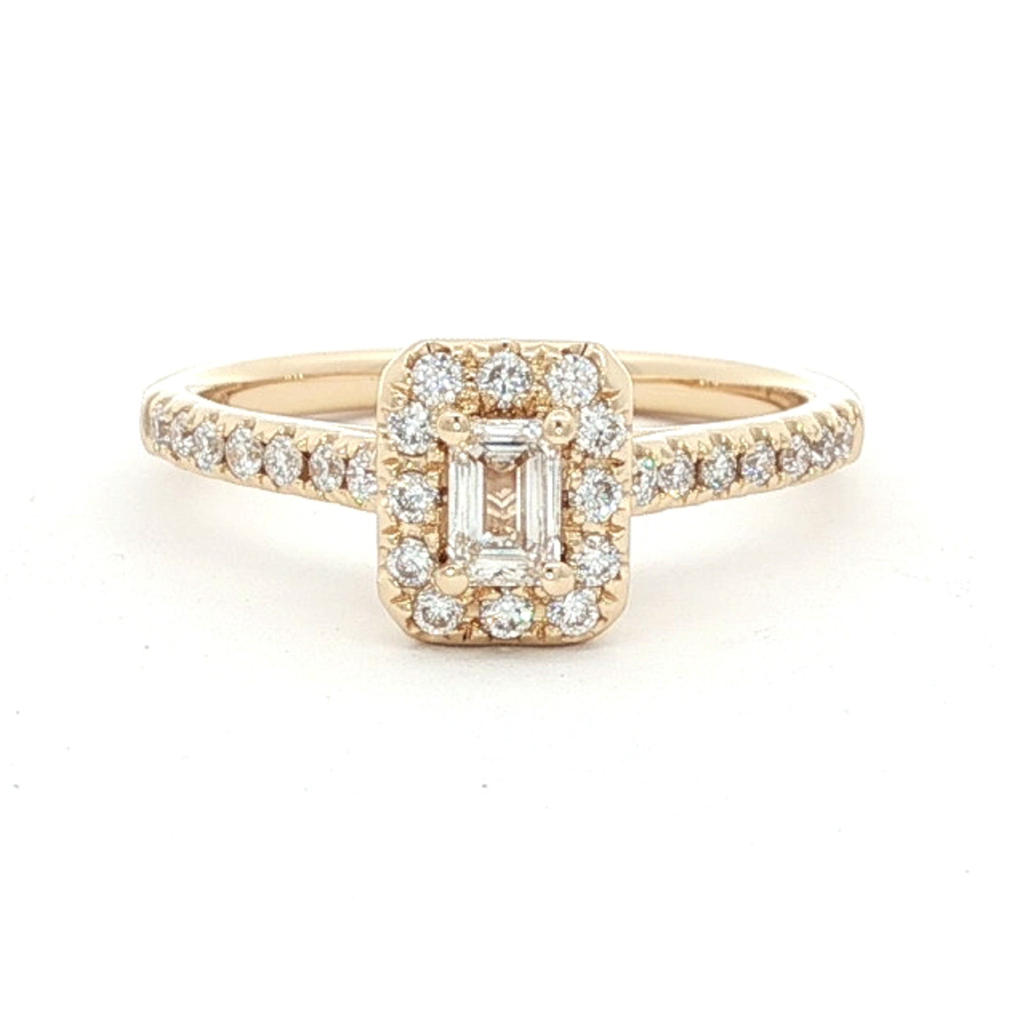 Experience timeless sophistication with this cathedral halo ring, featuring a .23 carat emerald cut, prong set center stone accented by .28 carats of brilliant round pave-set diamonds, all set in polished 14K yellow gold. Custom sizes may be available upon request.