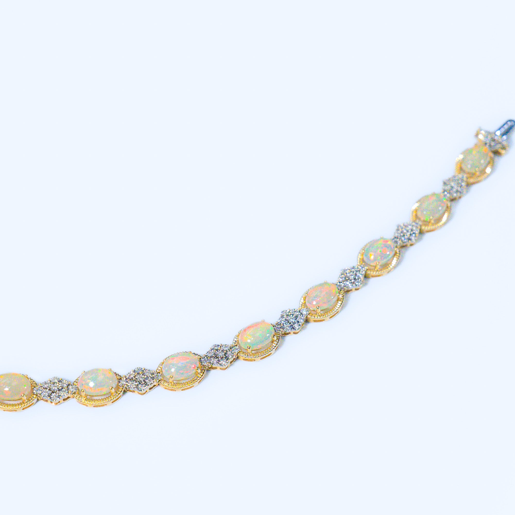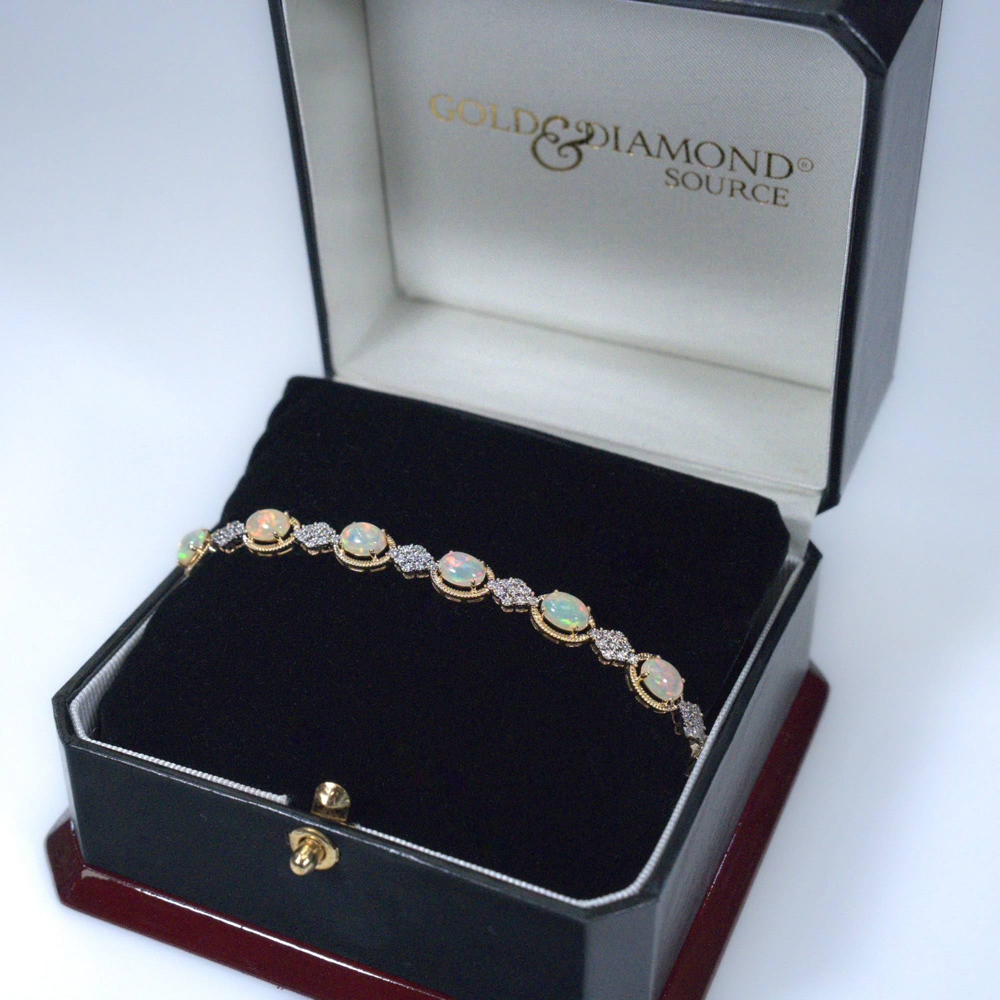 This captivating 14kt gold bracelet showcases 6.00 ctw of prong-set oval opals, each glowing with vibrant color and elegantly accented by .33 ctw of sparkling diamond clusters. Measuring 7.3 mm wide and 7.4 inches long, it offers a perfect blend of iridescent beauty and timeless sophistication.