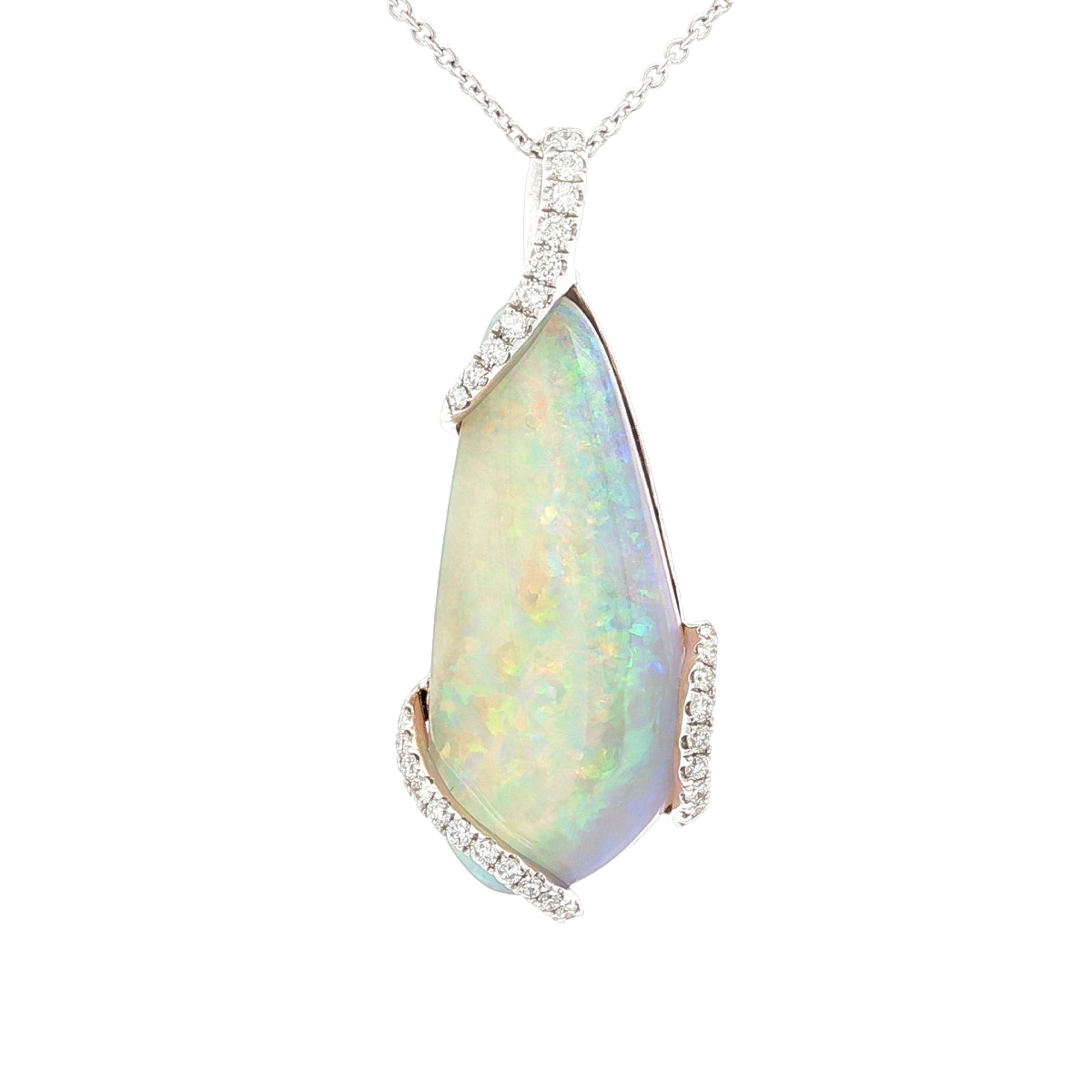 This striking 18K white gold pendant showcases a 9.13 carat elongated opal wrapped in a flowing pave diamond setting totaling 0.36 carats. Its freeform design highlights the opal’s natural beauty, measuring 37mm by 15.3mm. Chain sold separately.