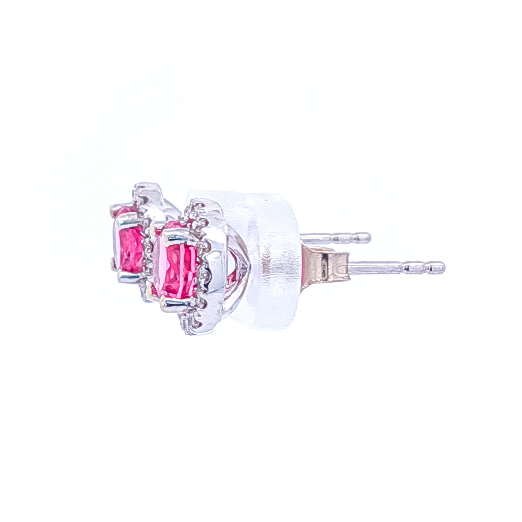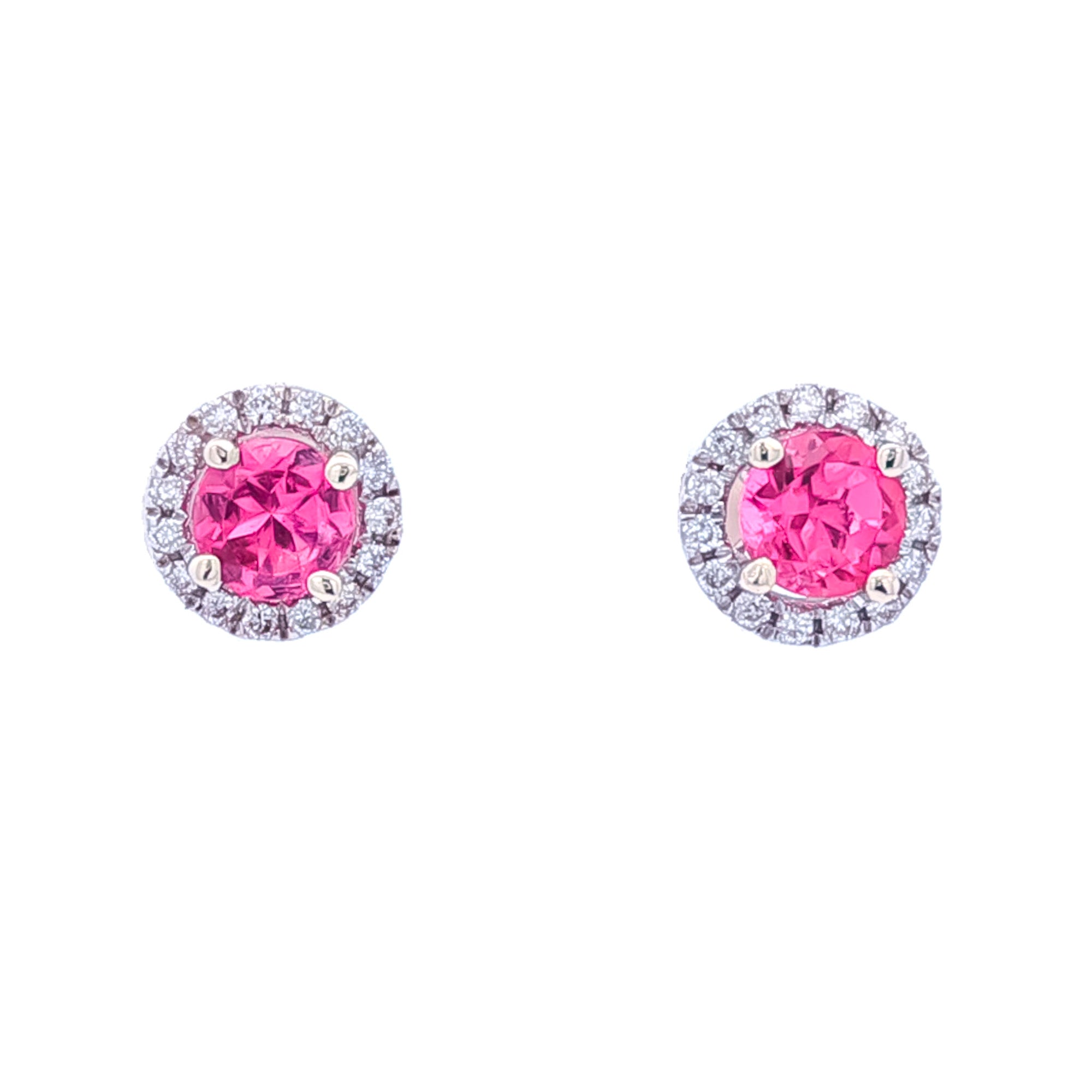 Add a pop of color with these elegant 14kt white gold stud earrings, featuring .94 ctw (.47 per earring) of bright pink round tourmalines, each prong-set and surrounded by a .20 ctw (.10 per earring) pavé-set diamond halo. With a 8mm diameter and secure stud posts, these earrings offer timeless sparkle with a vibrant twist.