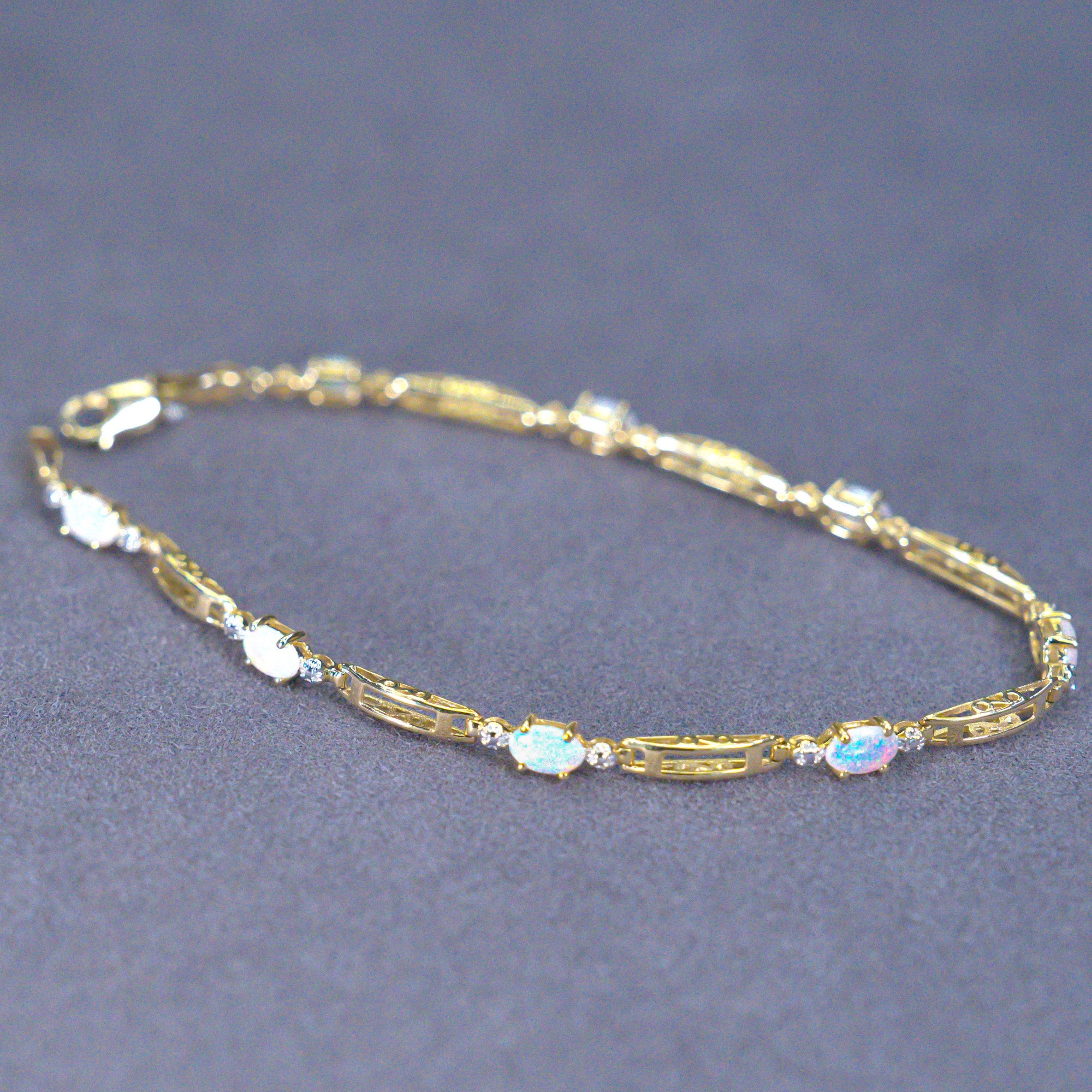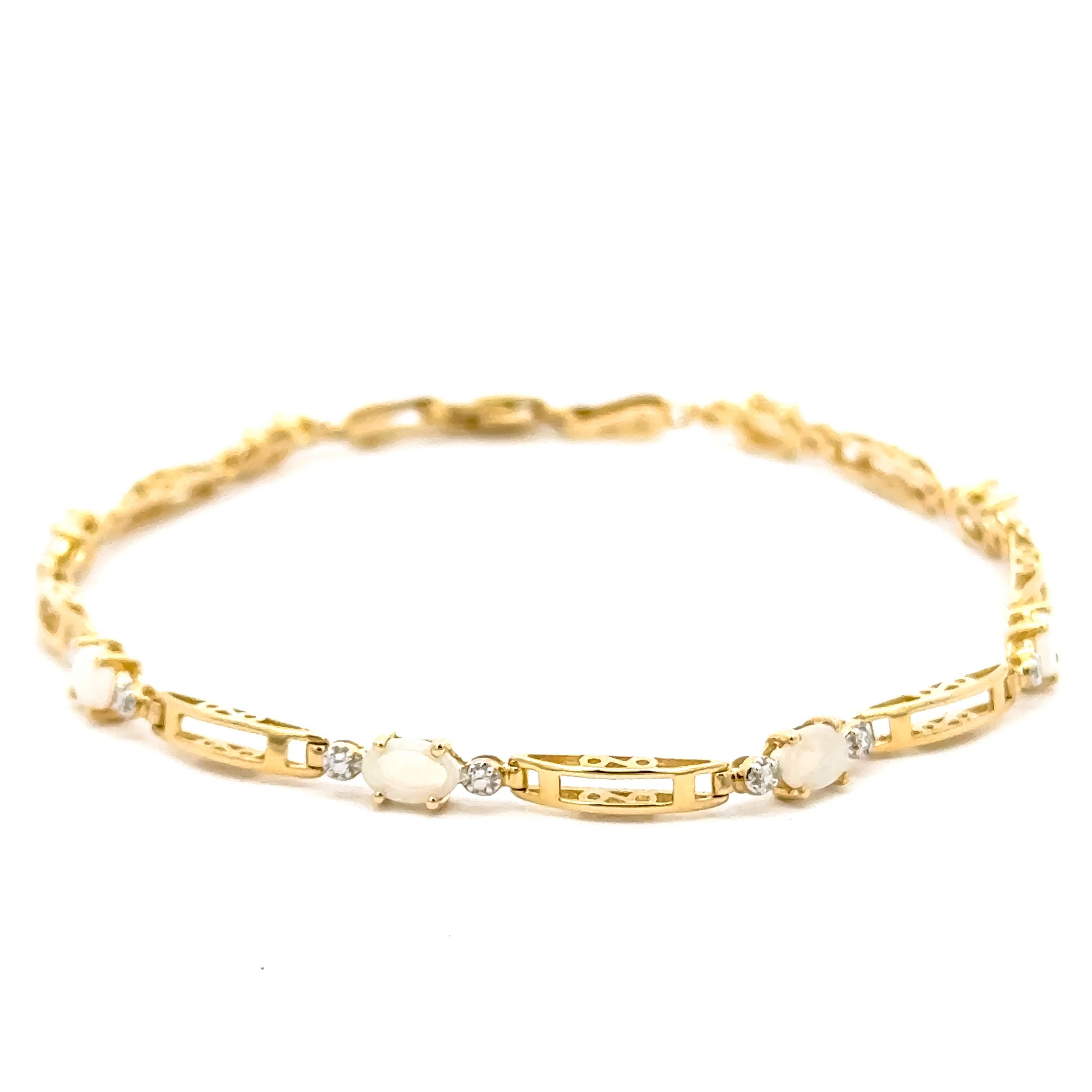 Delicate and timeless, this 14kt yellow gold link bracelet showcases eight prong-set 5x3 mm oval opals, accented by .005 ctw diamond. The opals and diamonds alternate with elegant scroll-pierced gold links, creating a graceful flow of color and sparkle. Measuring 7 inches in length and secured with a lobster clasp, this bracelet is a refined statement piece for any occasion.