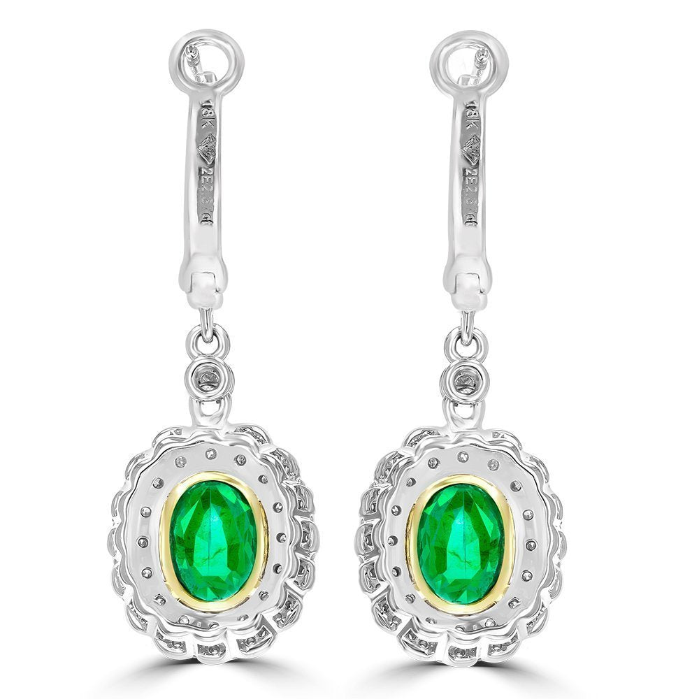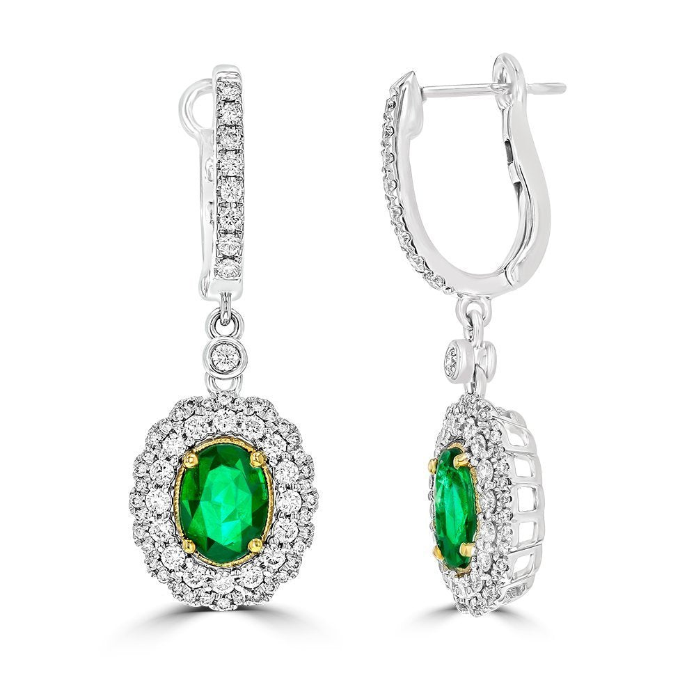 Juleve Oval Emerald & Round Diamond Halo Dangle Drop Earrings. These Glamorous Earrings Feature 2.37 Carats Total Weight Of Oval Emeralds Surrounded By A Halo Of Round Diamonds That Weigh 1.53 Carats Total Weight. The Earrings Are Crafted In 18 Karat White & Yellow Gold Accent.