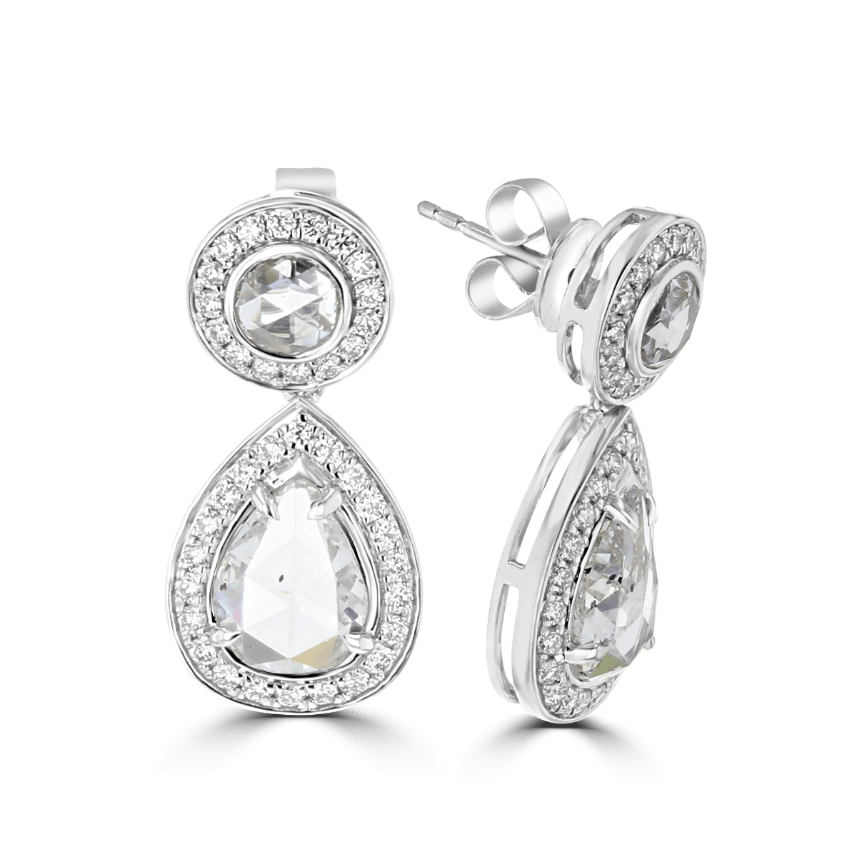 Juleve 18 Karat White Gold Rose Cut Diamond Pear Halo Drop Earrings Featuring 2.66 Carat Total Weight Pear Shape Rose Cut Diamonds, .56 Carat Total Weight Round Rose Cut Diamonds, and 1.05 Carat Total Weight Round Brilliant Diamonds.