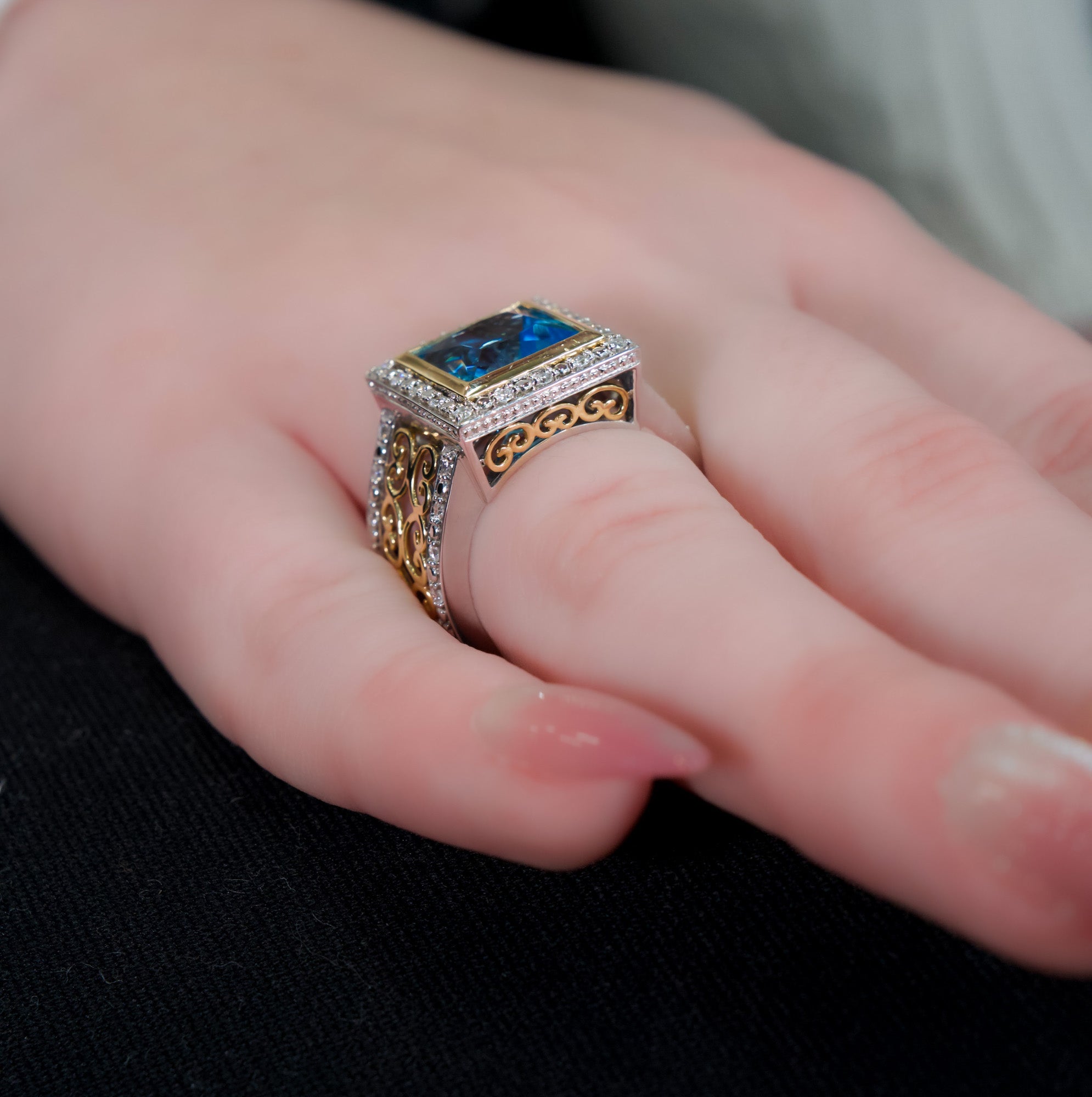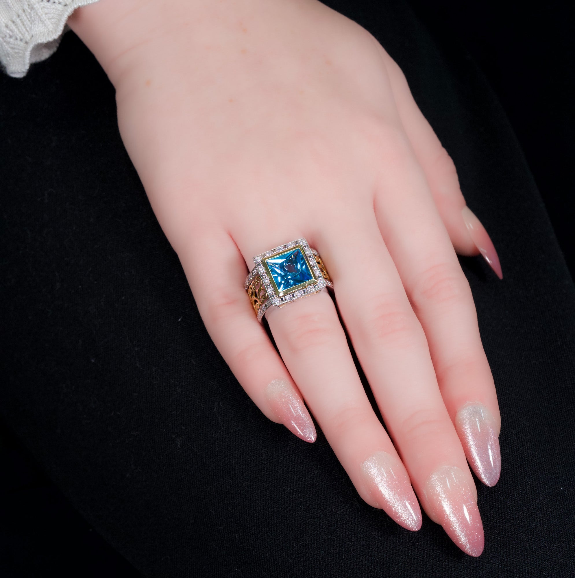 14 Karat white and yellow gold princess cut gemstone and diamond halo ring. The ring features 0.32 carat total weight of round brilliant diamonds. This exquisite ring comes with a 10x10MM Princess Cut Swiss Blue Topaz or Princess Cut Amethyst Center Gemstone.