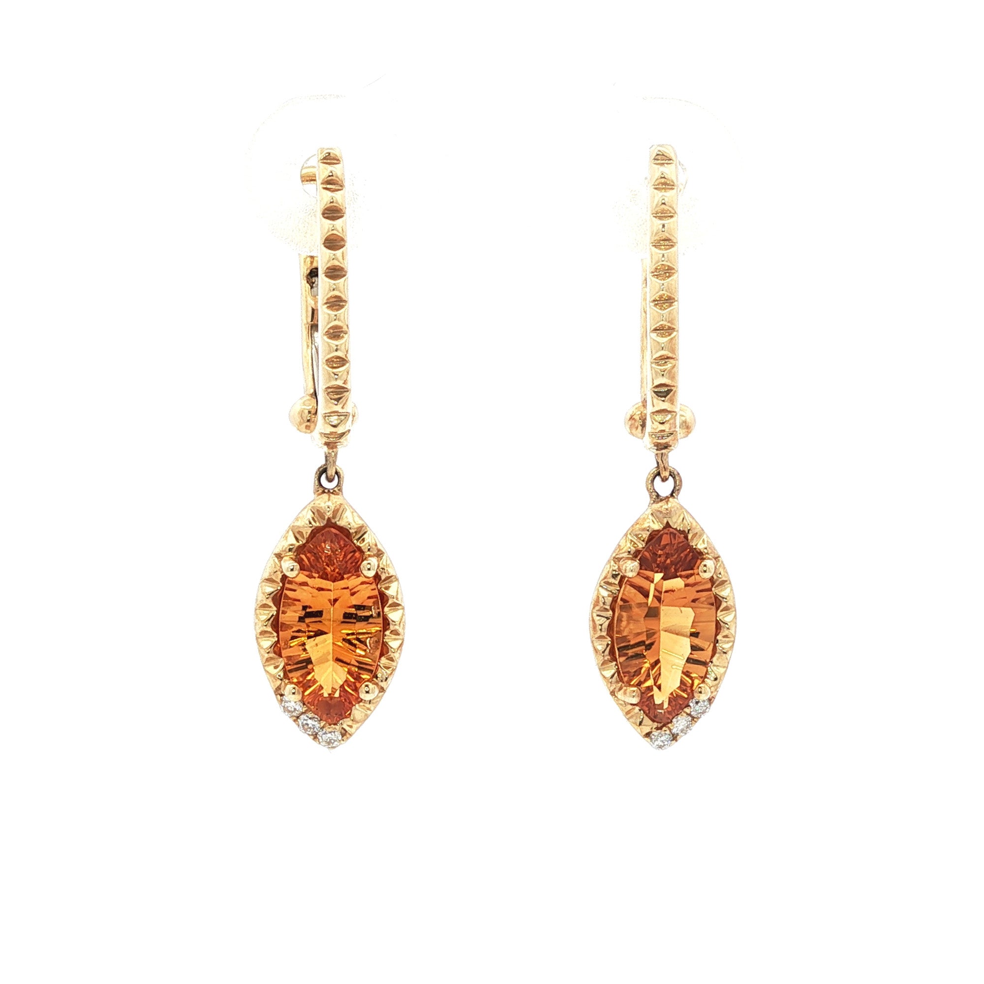 A pair of 1.70 ct marquise citrines shimmer with diamond accents in refined 14K yellow gold. Each citrine measure 10x5 mm, with an overall size of 30L x 7.5W x 11D mm each earring. Convenient leverback style for secure fit.