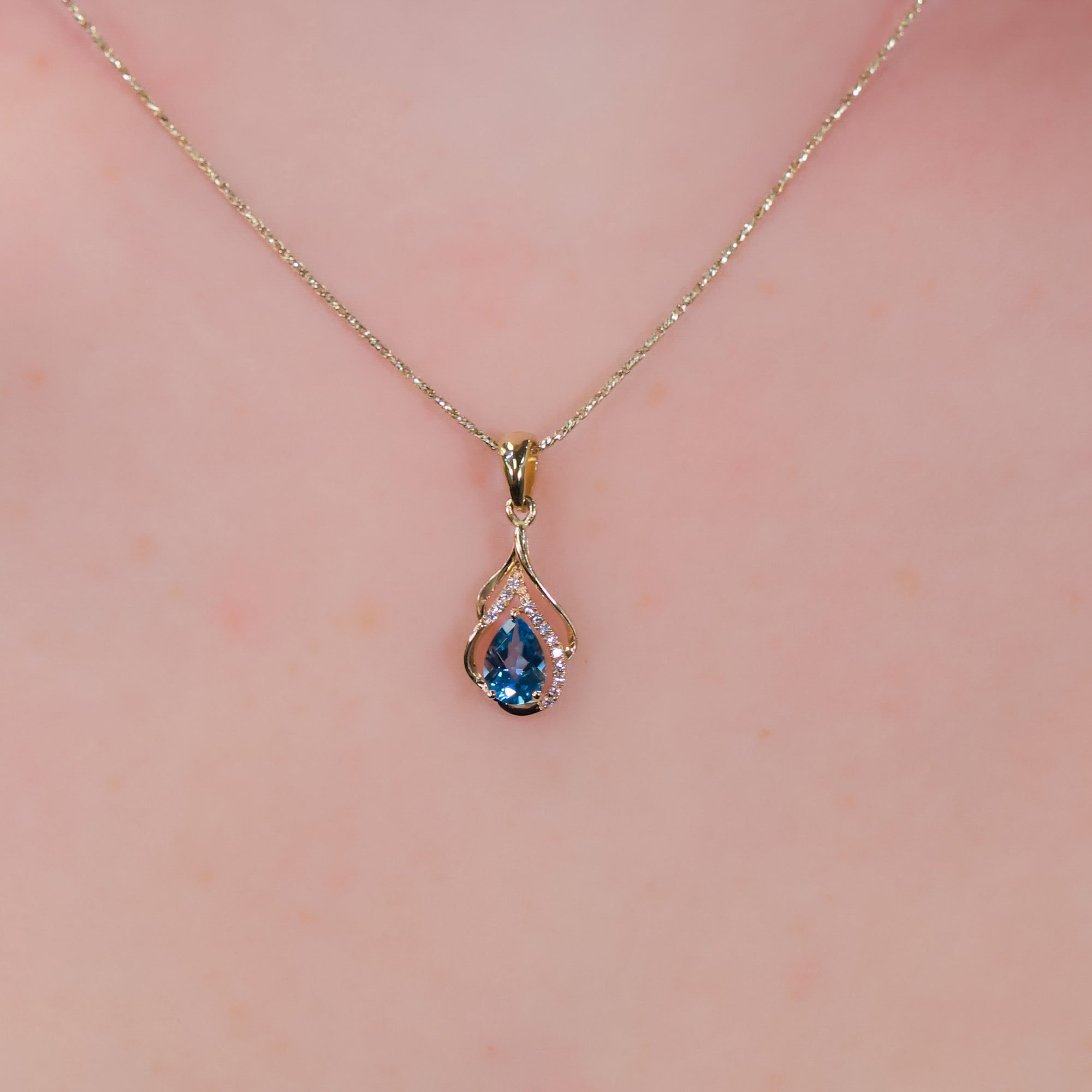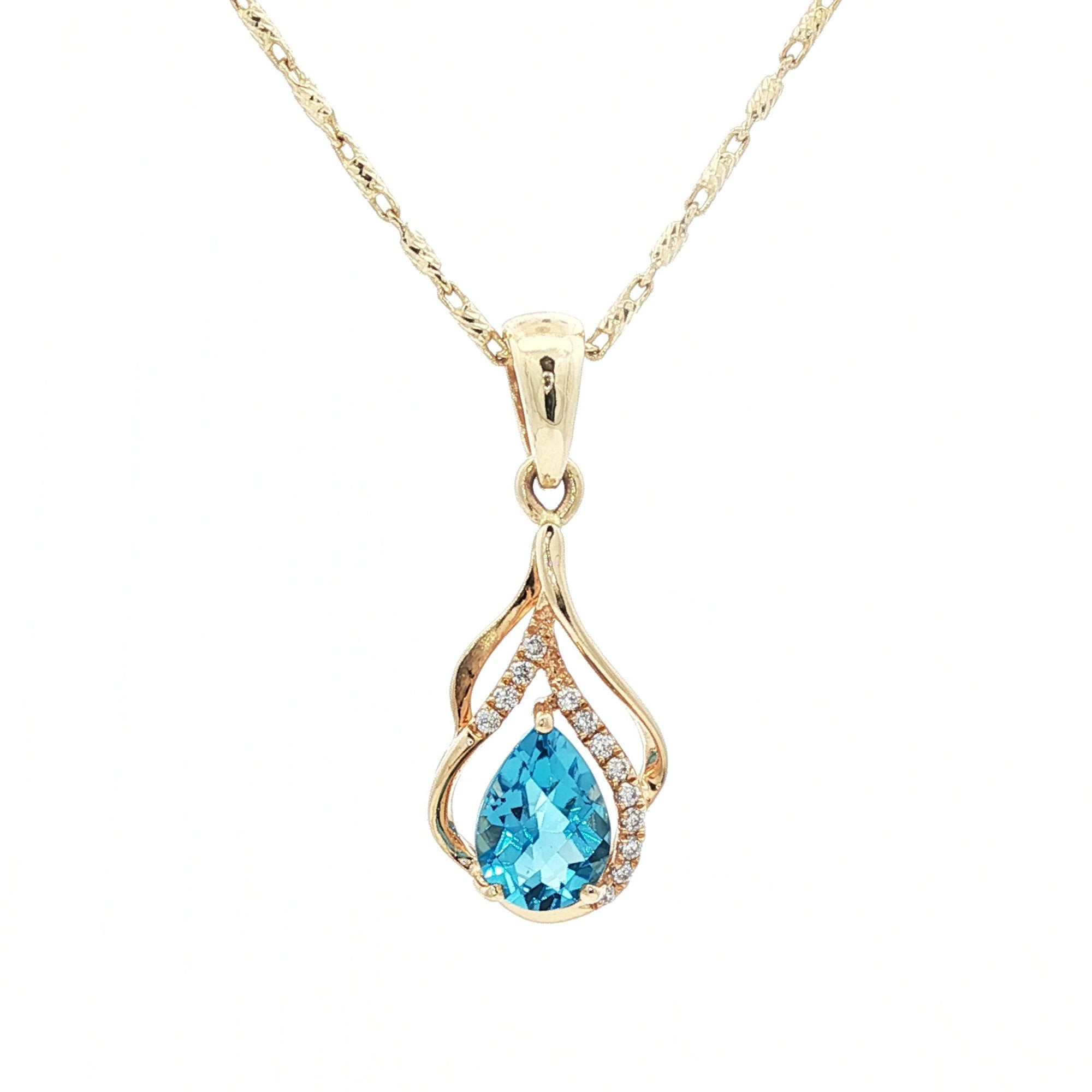 A swirling 14K yellow gold design embraces a .77 ct (7x5 mm) pear shape Swiss blue topaz, accented with .04 ctw diamonds for subtle sparkle. The pendant measures 22L x 9W x 4.25D mm, with an attached gold bail. Chain is sold separately. This item may take up to 4-6 weeks to receive if it is not currently in stock. Please contact us for current availability.