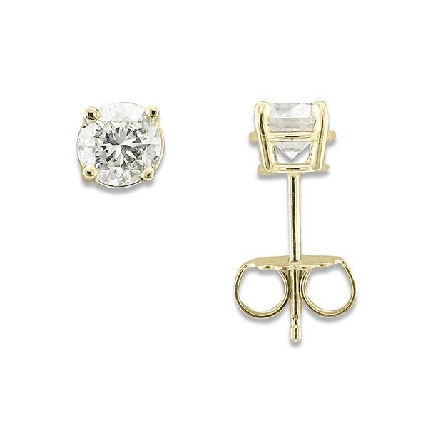 14 Karat Yellow Gold Round Diamond Earrings. The diamonds weigh 0.75 carats total weight and display K-L color and I2 clarity. The earrings come with 4-prong settings and friction backs. Diamond weights are approximate. Total carat weight of diamonds in earrings can vary plus or minus 5 percent. The diamonds shown in images may not be the exact ones received. Images represent approximate color and quality.